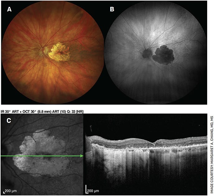Dr. Margaret Chang: At each visit, I perform FAF, OCT and BCVA. FA can also be useful to detect hidden CNV lesions at the edge of the GA lesion, although fluid will usually be present in that area on OCT. The fellow eye of a patient with central GA is definitely at higher risk of GA progression and vision loss, especially if it has any parafoveal lesions. Some central drusenoid pigment epithelial detachments (PEDs) will reabsorb and become central GA; if the height of a drusenoid PED decreases, central GA can follow in as little as 6-12 months.