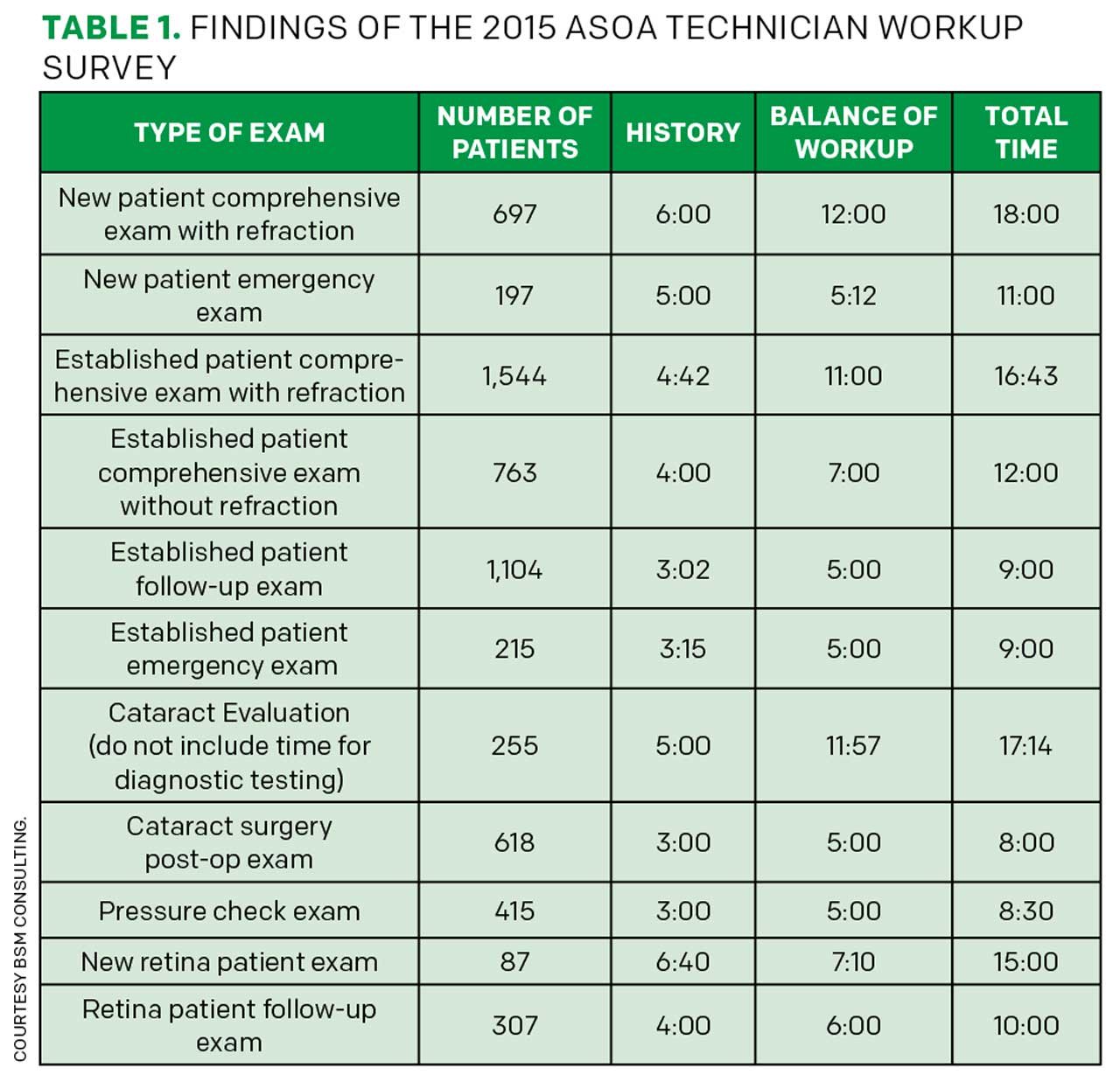 In 2009, Eyetechs, BSM Consulting and the American Society of Ophthalmic Administrators conducted a joint survey to study the time taken by ophthalmic technicians for each step of the workup process. Their findings have since guided numerous practices in estimating technician time with patients based on the specific exam elements.