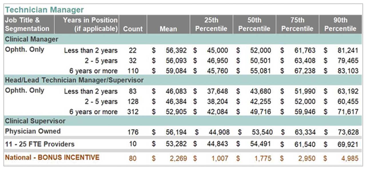 Additionally, the Healthcare Group also publishes ophthalmic wage data for purchase.6 The American Society of Ophthalmic Administrators is launching a new staff salary survey in May 2024.7 There is concern that some legacy salary surveys could be discontinued due to a lack of participation. Participating in salary surveys is crucial to ensure the entire industry has baseline data to compare within practices.