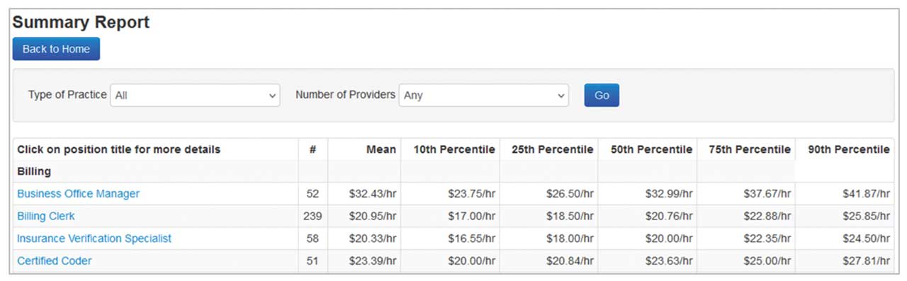 When reviewing salary data, match job descriptions and select the employee’s experience. If an employee works in multiple positions, choose the position that would be the most difficult for you to replace. Once you select those data sets, review the number or count of practices reporting information and look at the range from the 10th to the 90th percentiles (Figures 1 and 2).