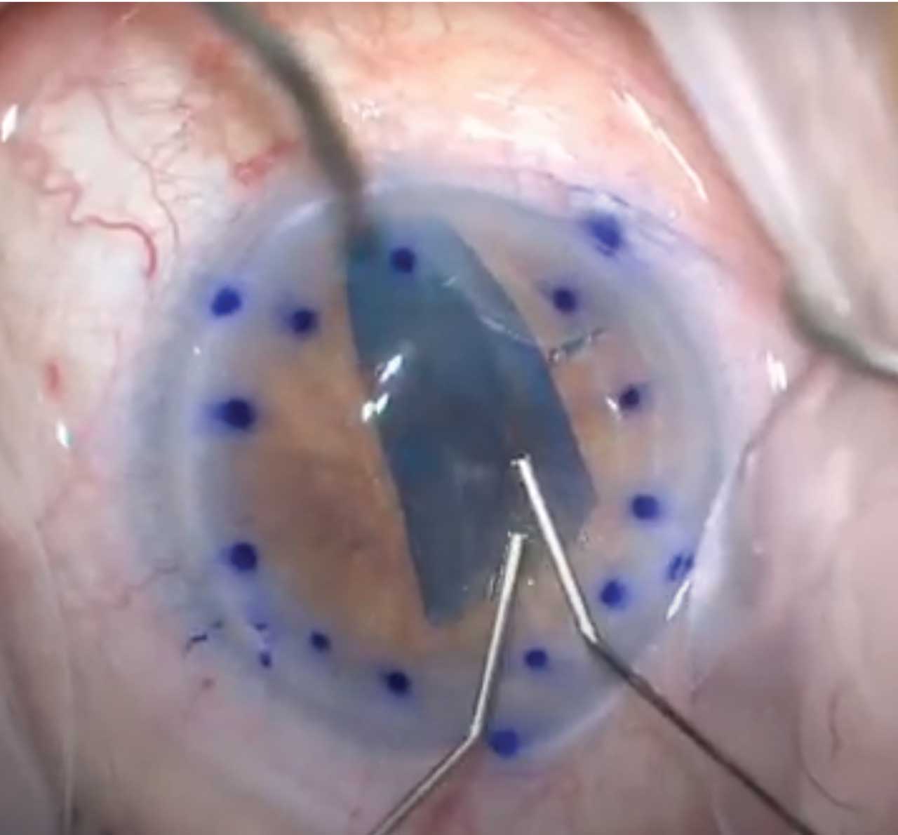 PK involves complete replacement of the host cornea with a full-thickness donor corneal graft and can be utilized to treat a broad range of corneal disease. In PK, a trephine is used to make a full-thickness incision into the host cornea to remove the diseased tissue, which is then replaced with a donor corneal button that is sutured in place.