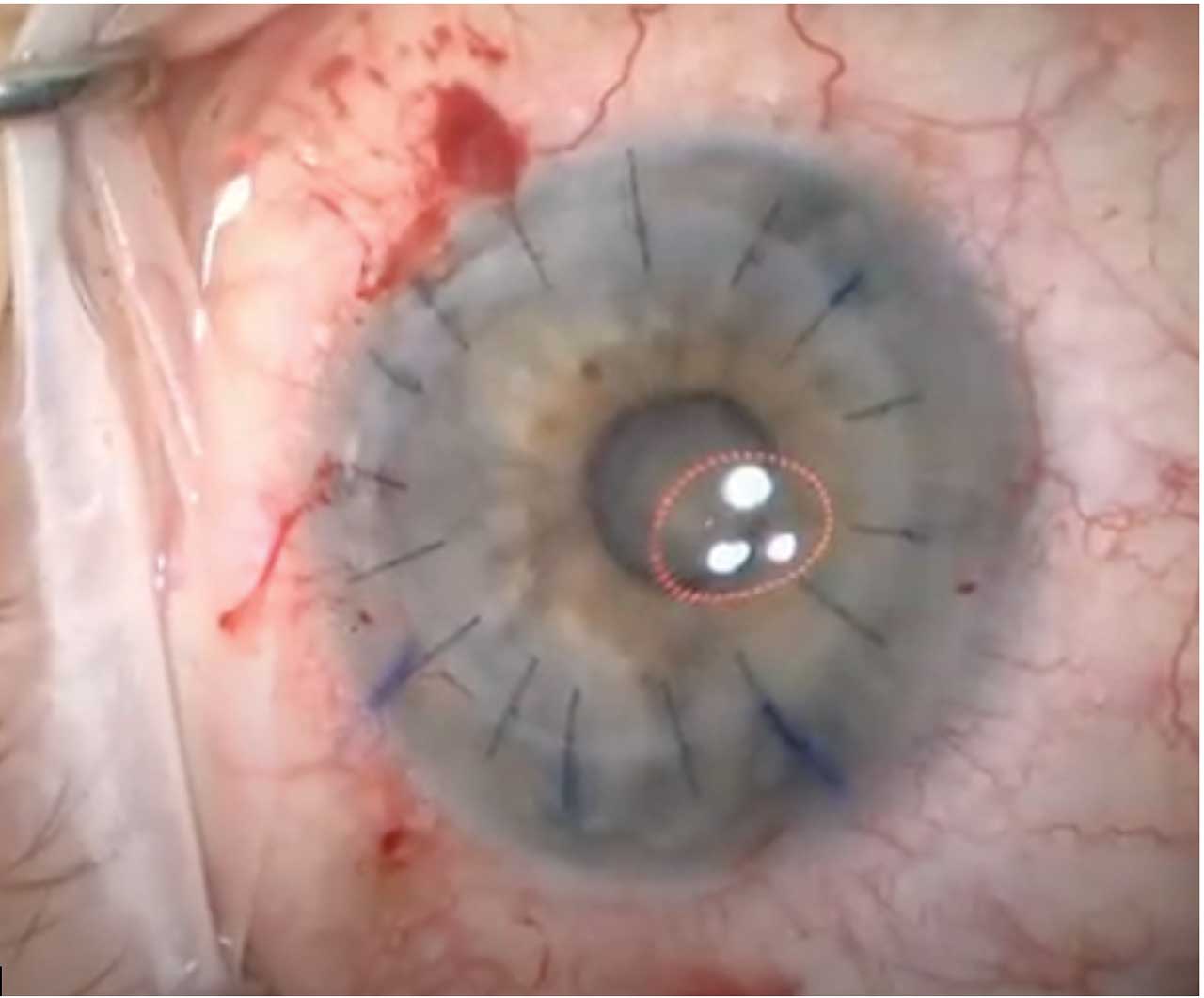 Induced astigmatism can also significantly affect visual outcomes following PK. Optimizing suture tension to achieve tissue apposition without inducing distortion and utilizing a keratoscope intraoperatively can help to mitigate postoperative astigmatism (Figure 1). The use of femtosecond laser technology has also been introduced as a means of creating better host-donor apposition in PK through more precise and customizable trephination options; however, clinical studies have not definitively shown a significant difference in long-term visual outcomes with the use of femtosecond laser compared to manual trephination.3