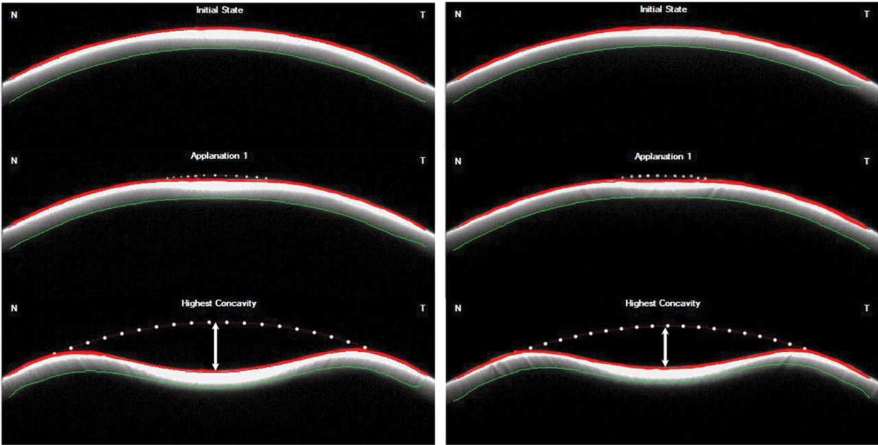 In addition to changes in the refractive qualities of the cornea, keratoconus affects its structural integrity. Recently, there has been significant interest in measuring in-vivo corneal biomechanical properties, such as elasticity and hysteresis, for detection of early keratoconus. The advent of new instruments that analyze deformation responses to measure these characteristics (eg, Ocular Response Analyzer, Reichert; CorVis ST, Oculus) may hold promise (Figure 3).11,12 However, there is limited evidence to support use of these tools for standalone screening.13 Rather, these instruments may provide additional measurements to help increase the sensitivity of more conventional modalities or may be useful in multivariate models of disease.4