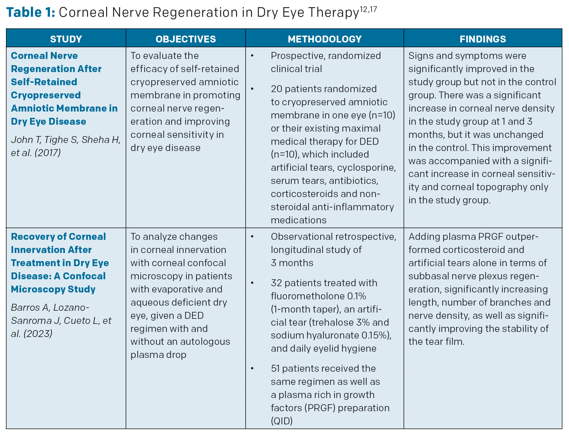 Autologous serum-based eye drops are another option that can help patients who have found insufficient relief from other therapies. Serum tears have demonstrated efficacy for corneal nerve regeneration in some patients,15 but a systematic review of randomized controlled trials found mixed efficacy results in DED.16 Because of this, and due to cost and logistical concerns, I seldom use autologous serum drops in my practice. Selected studies of corneal nerve regeneration in dry eye therapy can be found in Table 1.