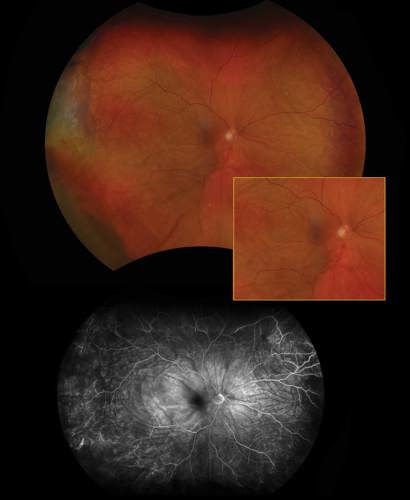Given the location of the lesion, ultra-widefield (UWF™) imaging (Optos) was conducted to capture the full extent of the pathology. The true color, optomap® RGB retinal image generated by our California device (Optos) supported a high-resolution visualization of the macular amelanotic lesion, choroidal folds, and diffuse thickening extending into the far temporal periphery. UWF fluorescein angiography (optomap FA) further captures the significance of the choroidal folds and showed increased hyperfluorescence. Late leakage from the optic nerve was also observed on optomap FA.