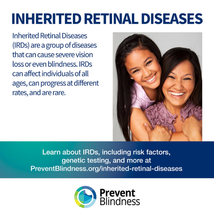 Prevent Blindness has designated May as its second annual “Inherited Retinal Disease (IRD) and Genetic Testing Month.” To educate the public and allied health professionals, Prevent Blindness offers a variety of free resources on IRDs, including educational videos featuring medical experts and individuals living with an IRD, webpages, and shareable social media graphics and fact sheets in English and Spanish.