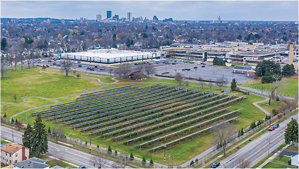 The Rochester campus is already powered in part by a large solar field, which covers four acres and includes 3,667 solar panels. This array produces more than 1.1 gigawatts of energy—about 8 percent of the overall electrical needs for the 57-acre campus, which includes administrative offices as well as manufacturing. The solar field also eliminates approximately 8,000 metric tons of carbon dioxide equivalent (CO2-eq) from the atmosphere from conventional power generation annually. This is roughly equivalent to removing 1,730 gas vehicles from highways for a year.
