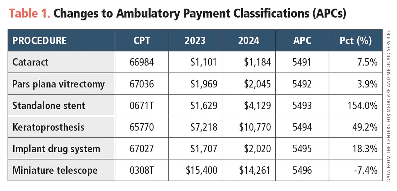 Kevin J. Corcoran, COE, CPC, CPMA, FNAO, senior consultant and co-founder of Corcoran Consulting Group in Springfield, Missouri, says the increase for intraocular procedures actually range from 3.9% to 154%, which is considerably higher than the 3.1% increase. The only intraocular procedure to see a reduction in reimbursement is implantation of the miniature telescope, which has decreased by 7.4% (Table 1).