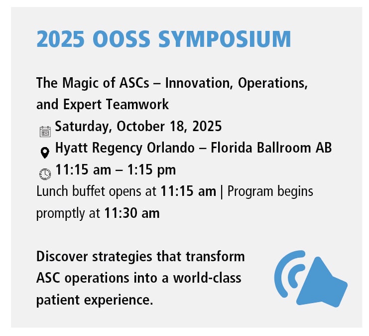 Join OOSS for an energizing educational lunch that tackles the most urgent challenges and exciting opportunities for ASCs (see 2025 OOSS Symposium, above). Learn how to optimize operations, improve financial performance, embrace breakthrough innovation, and deliver patient care that’s truly magical—right in the heart of Orlando.