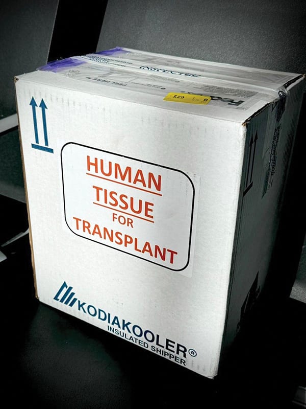 Sure enough, when Dr. Shafer was going through security, he was asked about the contents of the box. “I said, ‘This is human tissue for transplantation. It’s not allowed to go through the X-ray scanner because it’s tissue and we want to make sure it stays alive. We don’t want the X-rays to damage it.’”